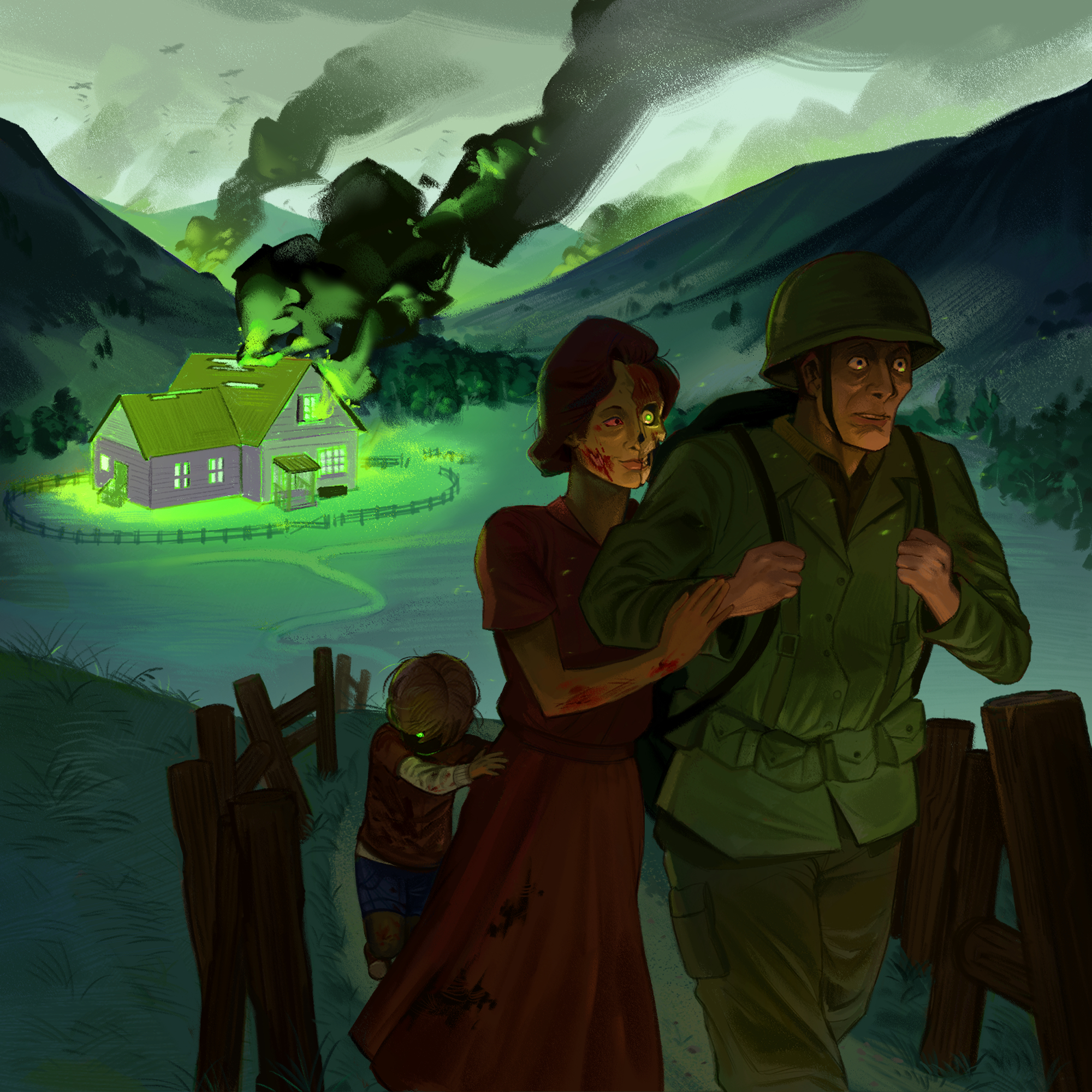 Mia shared that the song Capitol Hill in particular made a strong impression on her. She crafted a haunting image on digital media, pulling from many classic animation styles. A shell-shocked soldier struggles with his family to escape the apocalypse, his suburban dreams shattered. They confront a damaged future where technology plays an unexpected and horrifying role.