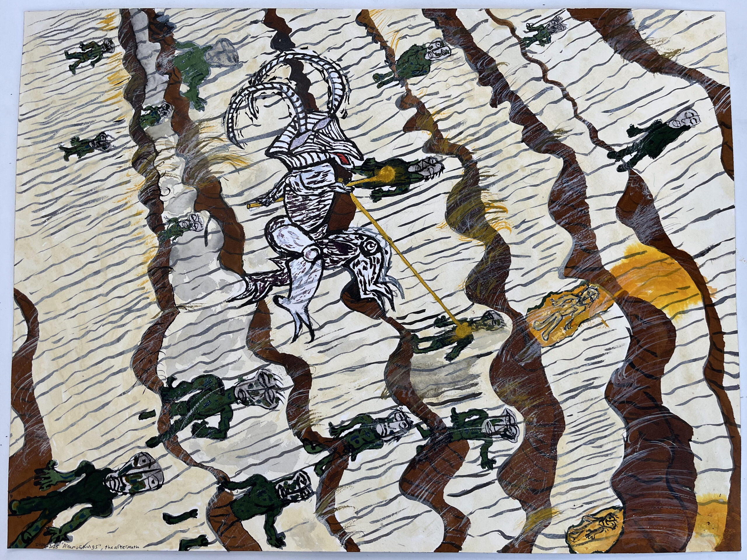 Tony shared that he was particularly taken with the phrases “sand turned to glass” and “our mutant descendants will be free one day” in All That I Know. With personal connections to New Mexico and its geology, and with echos of Alamogordo glass in his mind from the first nuclear tests at Trinity, he was drawn to the abstract image of a demonic, mutant Ibex Man unleashing his rage upon those who had wronged him.
